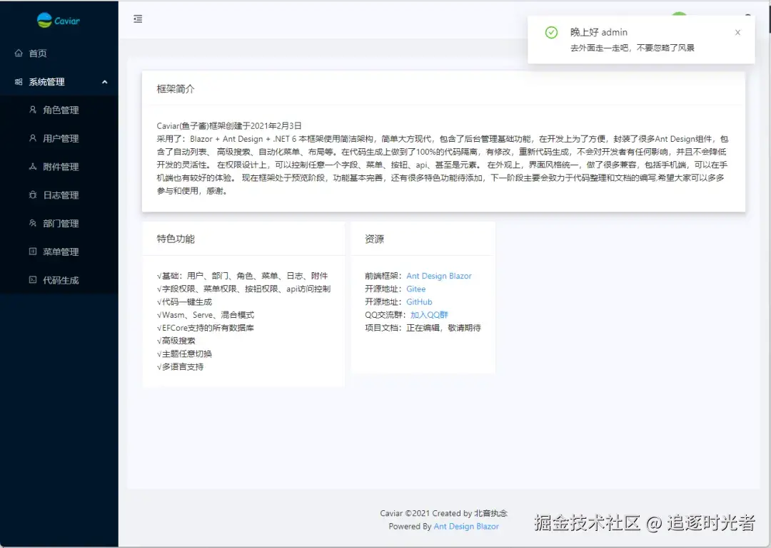 - 项目简介: Caviar 是一个基于 .NET 8 + Ant Design Blazor 开发的、基于 Apache-2.0 协议开源的后台管理框架,使用简洁架构,简单大方现代,包含了后台管理基础功能,在开发上为了方便,封装了很多Ant Design组件,包含了自动列表、高级搜索、自动化菜单、布局等。此外,该框架在代码生成上实现了100%的代码隔离,确保修改和重新生成代码不会对开发者造成任何影响,同时保持了开发的灵活性。