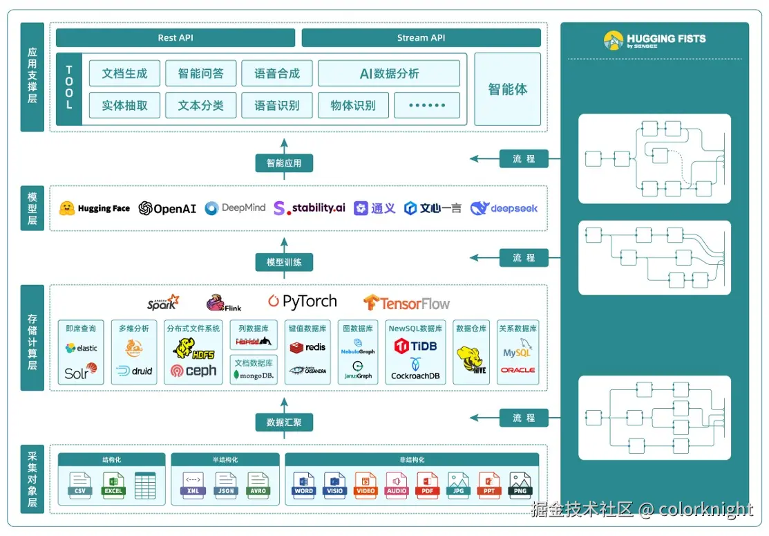 在进行AI的企业级落地时,不难发现,整理各类数据所需要付出的代价依然占据了项目中的大部分成本。相较而言,Dify、RagFlow等极易上手的工具在面对复杂的文件及数据场景时就显的不那么得心应手了。n8n能够处理复杂些的文本类数据,而面对诸如图像、音频、视频等数据时也会变得束手无策。而此时正是HuggingFists大限身手的时刻。