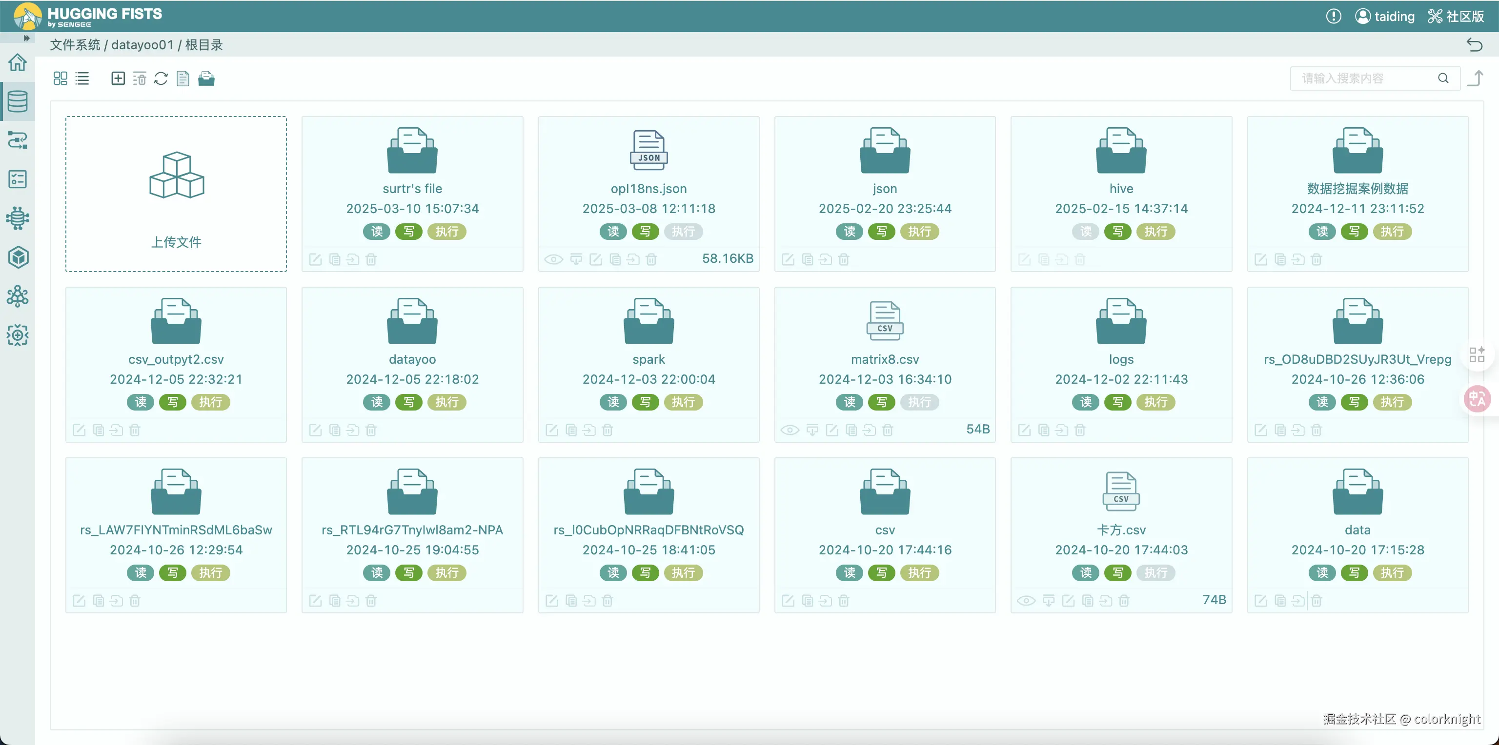 从功能架构可以看出,HuggingFists支持广泛的数据库以及文件系统。相比传统数据科学类工具以支持数据库为主,其支持了大量的文件系统,这也是其能更广泛的处理半结构化以及非结构化数据的基础。同时,它还支持事件流类的系统,如Kafka,可以实现实时数据的处理。另外,其对于所有支持的数据源,都提供一些基本的数据查看及管理功能,方便使用者了解数据。