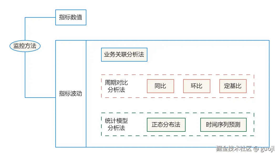 针对应用系统监控手段,当下主流方法主要包括指标数值、指标波动和业务关联分析。指标数值法,也就是配置指标告警阈值,检测是否达到阈值就进行告警处理。指标波动法,就是通过周期对比、统计模型(正态分布、时间序列)、业务关联分析法分析异常告警阈值。