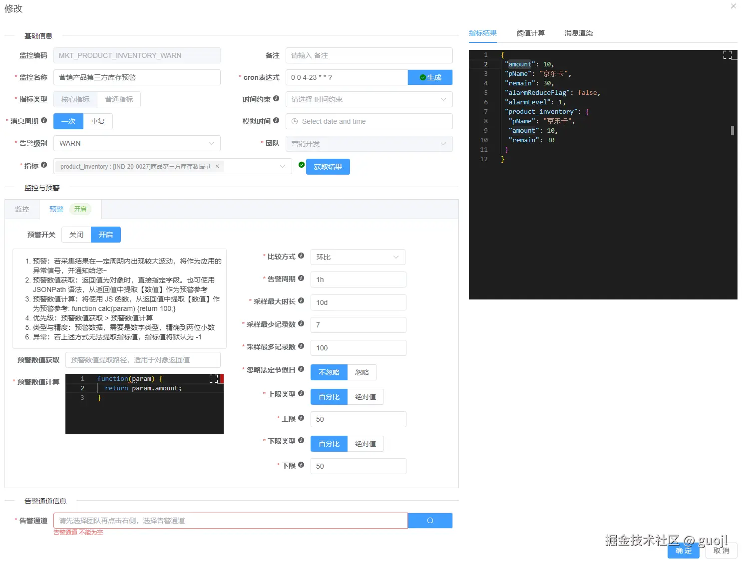 | 最小采样记录数 | 最小参与指标波动计算数据记录数,数据量少于此值不预警 |
