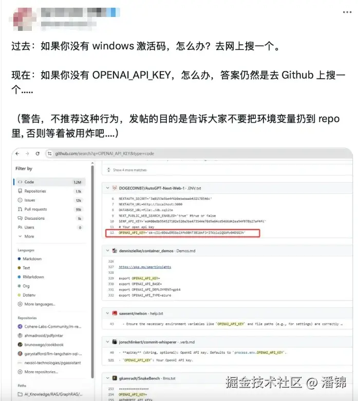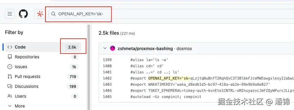 在 GitHub 上搜索 "OPENAI KEY=sk-",你能找到超过 2.5K 的代码记录。是的,是 2500+ 条。