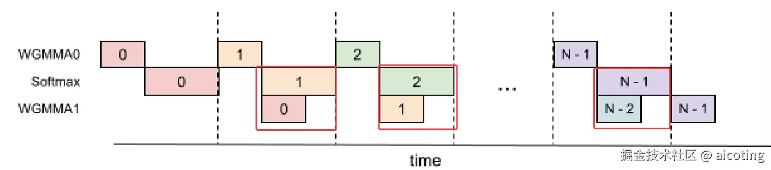 其中WGMMA也可以理解为GEMM,可以看到,迭代的第二个人WGMAA操作(第11行)和第二次迭代的softmax(第十三行)操作重叠,如下图