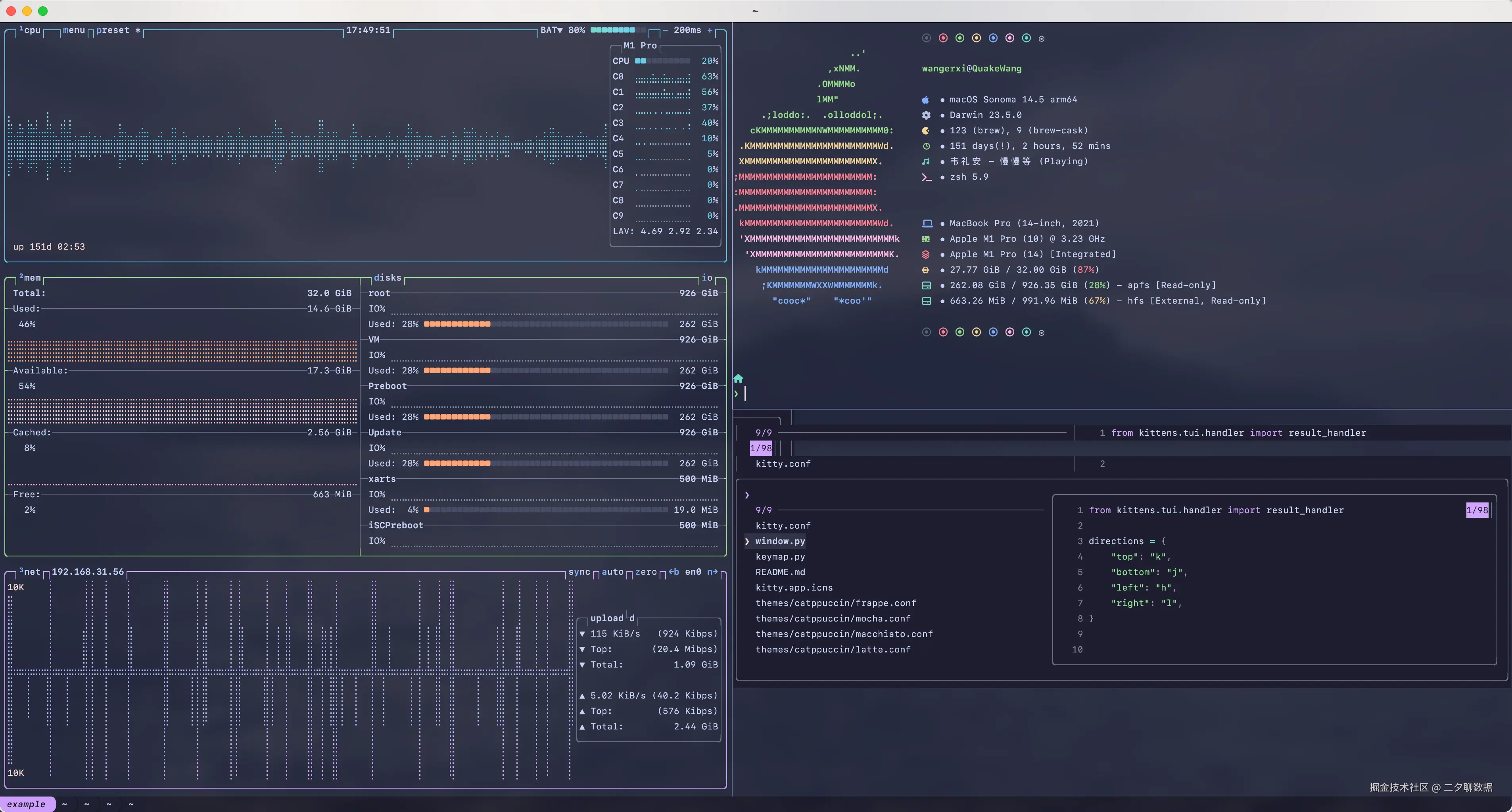 诶,本篇博客重点讲解了 Kitty 的配置,但上图演示的内容又是如何实现的呢?以及开篇吐槽的 oh-my-zsh 又该如何优化呢?在后续的文章会一步一步介绍,完整实现一个好用的 macOS,敬请期待。