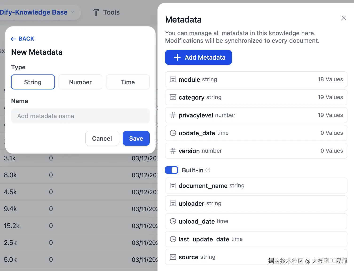 用户可添加和管理知识库中文档的元数据。每个文档在创建时都会自动分配一些默认元数据,如文件名、上传者、上传日期等。用户还可手动添加新的元数据字段、设置字段名称和数据类型,以及对现有文档进行批量编辑或修改。此标记过程允许用户向文档添加额外的结构化信息,使其更易于日后搜索和管理。