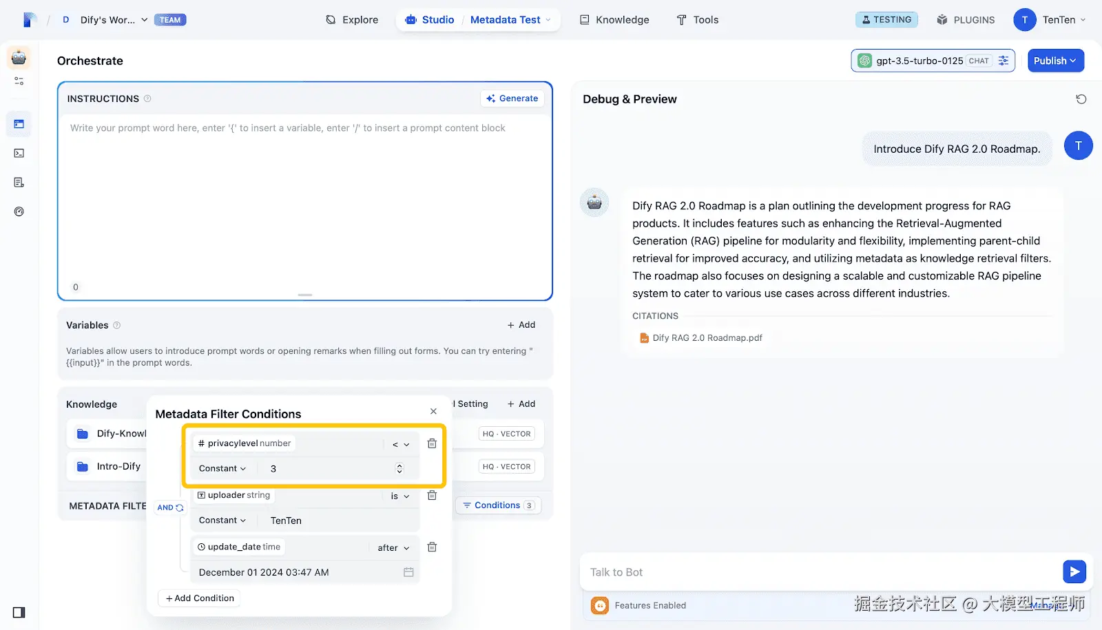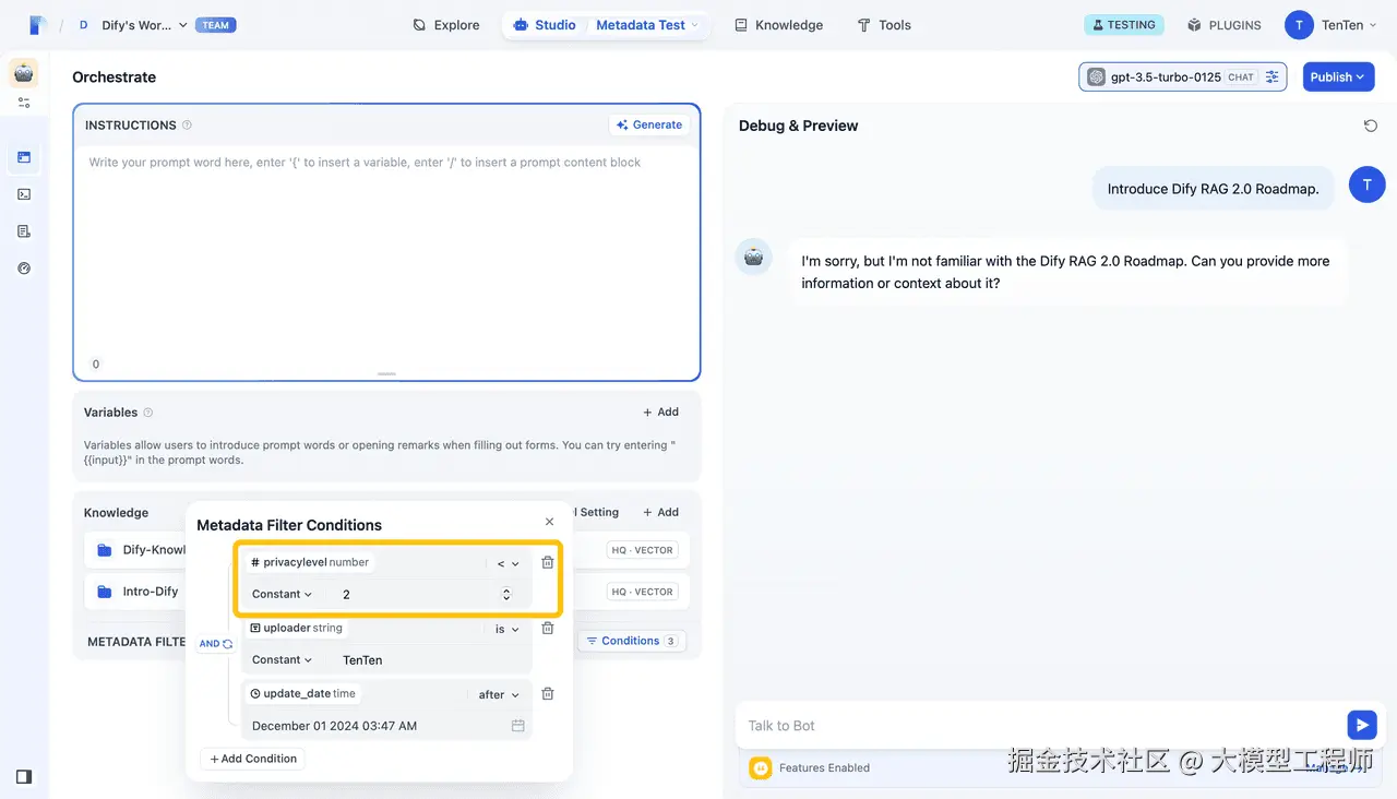 Dify v1.1.0,以元数据作为知识过滤器,对数据精确过滤和访问控制来提高准确性、安全性和效率,对有效的RAG管理至关重要。