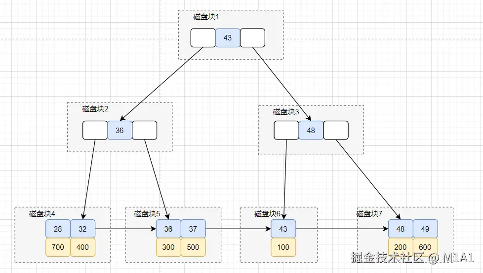 磁盘块3,找到了id=400,但是它不是叶子节点,所以会继续往下找。到磁盘寻址磁盘块8。 - 将
