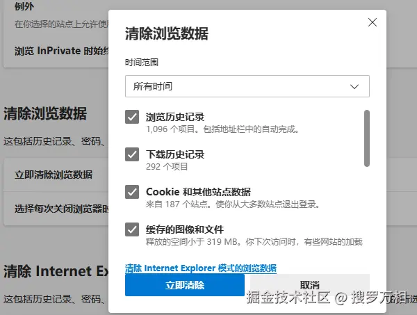 - 清除缓存、cookie 和历史记录;