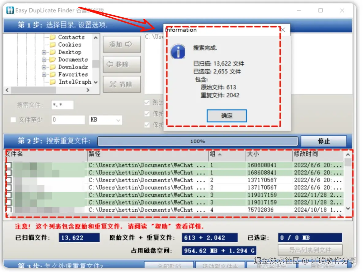 等待片刻后,系统会将重复文件清晰分类展示出来。