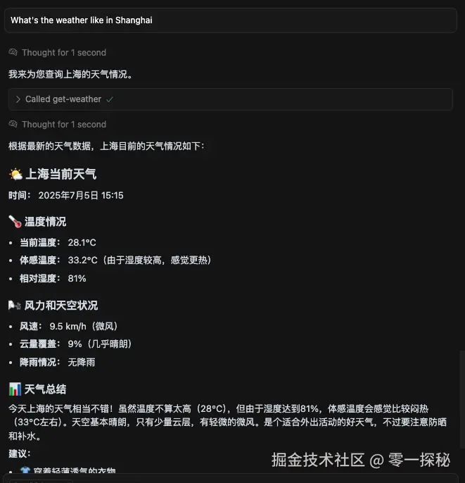 通过上述流程,可以看到在cursor中调用MCP 工具已经将原始 JSON 转换为美观的天气报告。