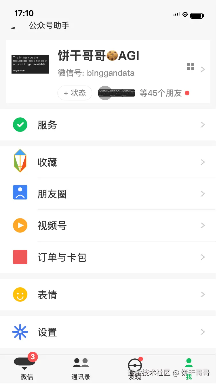* 需要精确复现卡通饼干头像、二维码、服务、收藏、朋友圈、视频号、订单、表情、设置以及底部导航栏的所有图标。