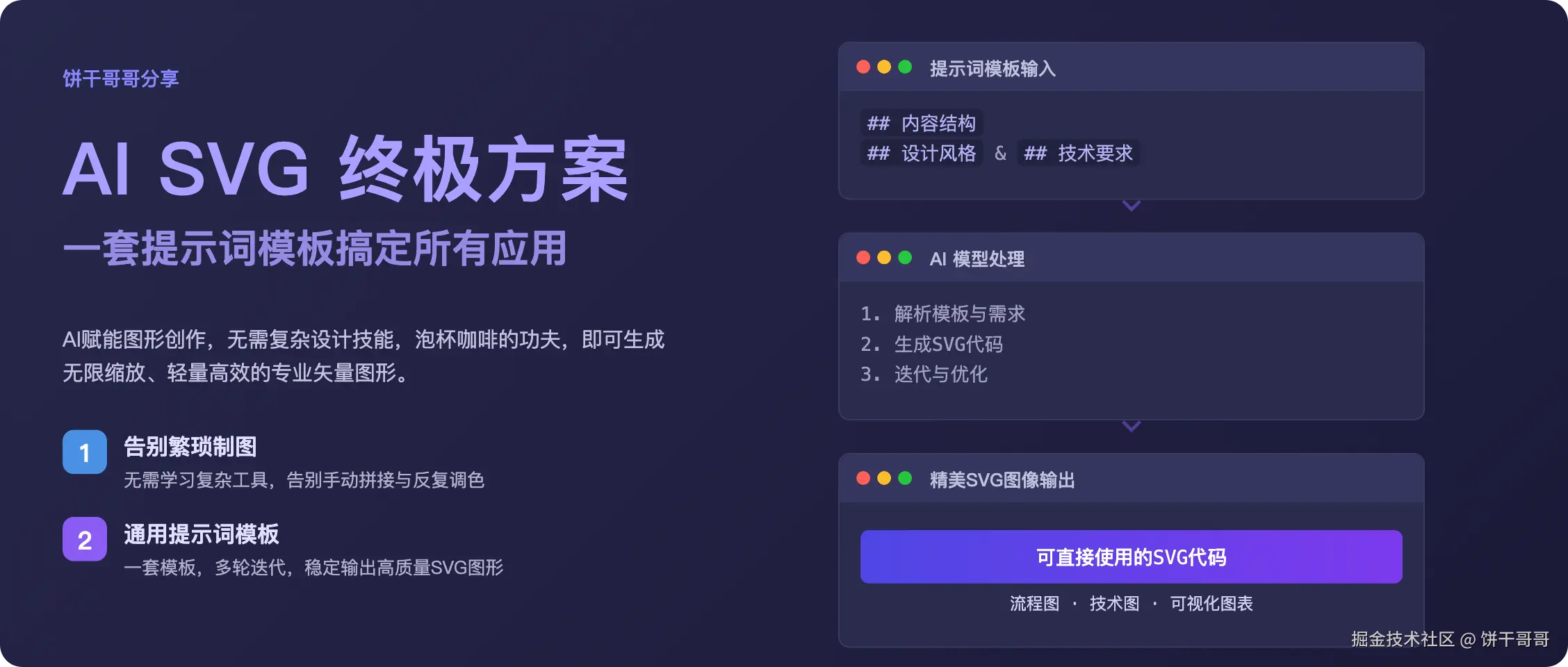 我最近也花了不少时间来分析各类SVG案例,总结出一套通用提示词模板,让你用一套模板就能生成各种精美SVG图形,无需记忆复杂提示词,无痛搞定所有应用,只有一句“so easy~”。