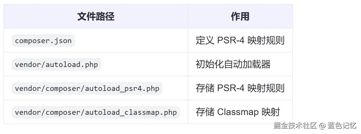 vendor/autoload.php:入口文件,初始化自动加载器。vendor/composer/autoload_psr4.php:存储 PSR-4 映射规则。vendor/composer/autoload_classmap.php:存储 Classmap 映射(如果有)。