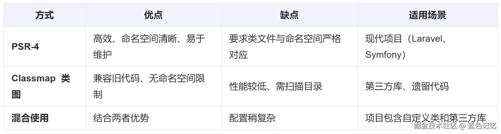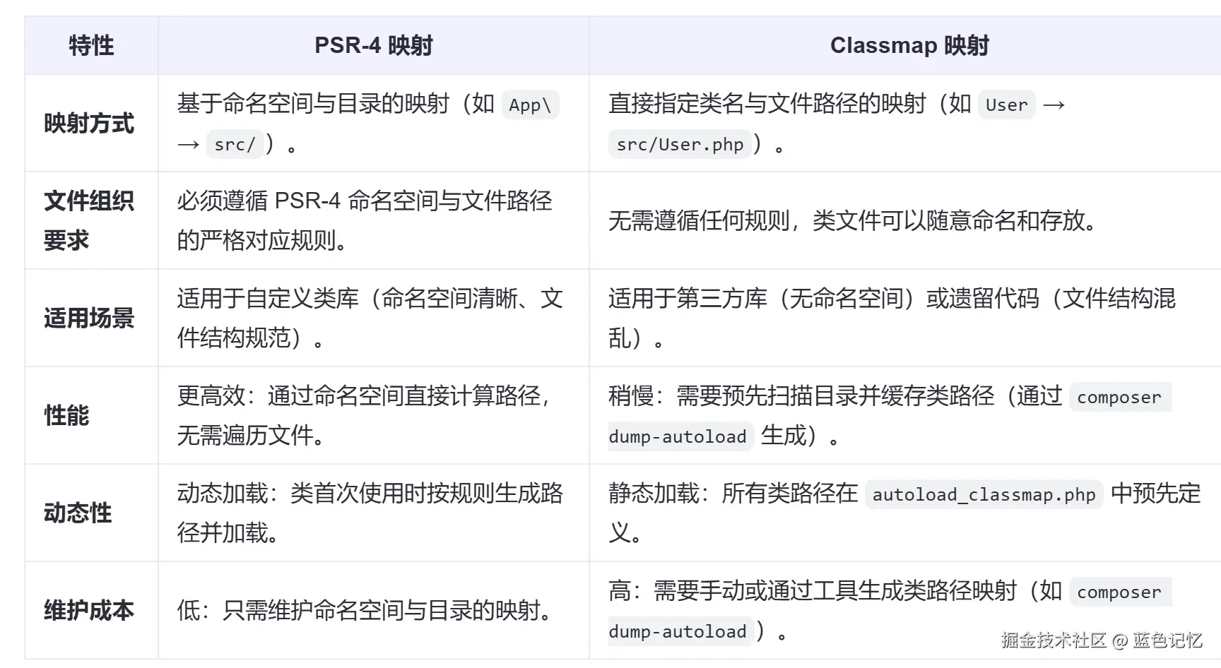 - Classmap 是兼容方案,允许加载不符合规范的类文件,但需要手动维护或通过扫描生成。