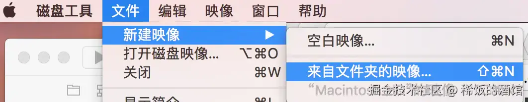 打包需要用到磁盘工具。打开系统自带的磁盘工具,选择顶部的 文件-新建映象-来自文件夹的映象。然后选择到我们的那个dmg目录。如图: