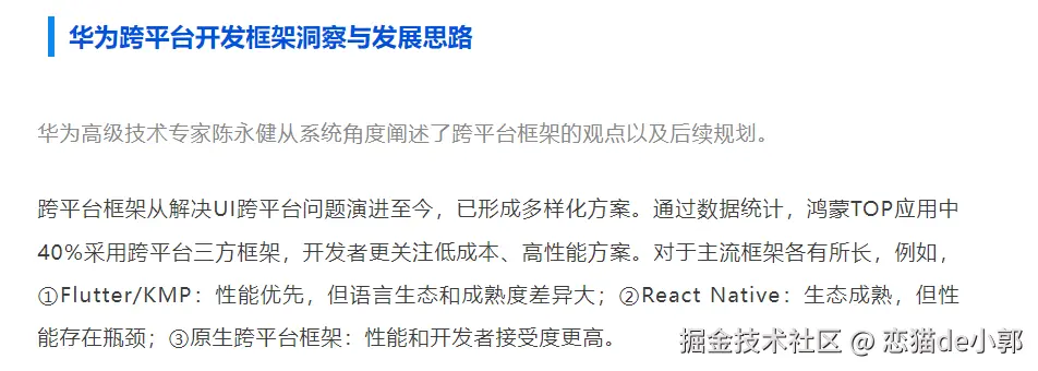 华为近期也提到过,目前鸿蒙 TOP 应用中 40%采用跨平台三方框架,其中主流就主要以 Flutter、RN 等框架为主,所以可以看到鸿蒙也是为 Flutter 提供了全新的开发场景: