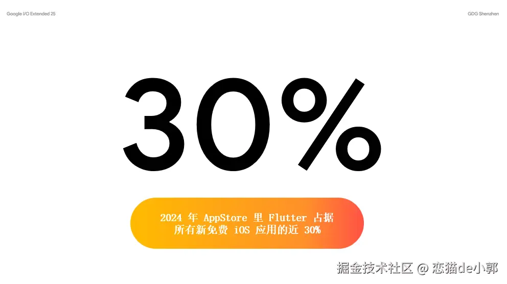 而根据 Apptopia 的统计数据,2024 年 AppStore 里 Flutter 占据所有新免费 iOS 应用的近 30% ,虽然这个数据已经不是很亮眼了,但是在如今这个市场环境下还算可以: