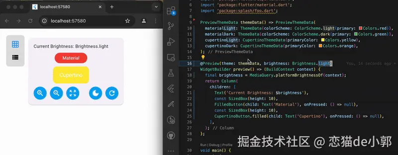 所以,可以简单理解,控件预览就是在项目的 .dart_tool 目录下生成一个预览工程,并通过 Flutter Web 的方式进行渲染,所以整体可交互程度也会比较高。