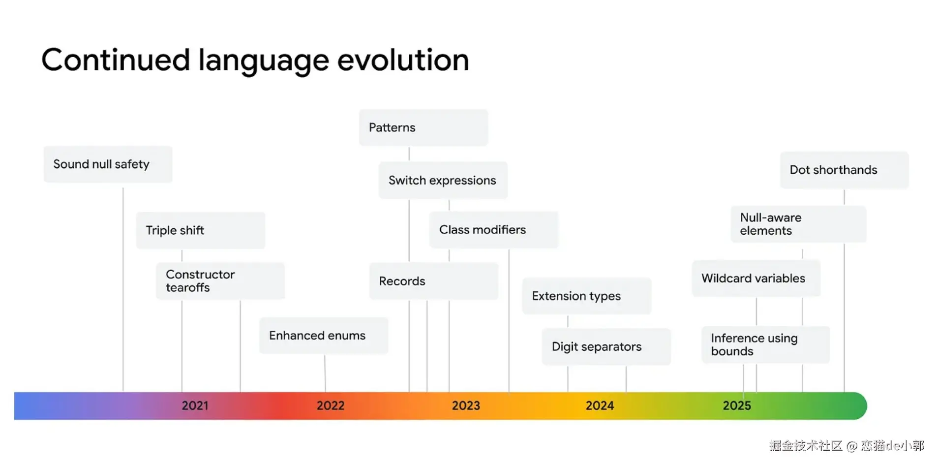 事实上,Dart 一直都一门保守的语言,它的新特性增加都十分克制,如果真要说开发体验,肯定是不如 Kotlin ,但是它的好处在于,可以完完全全贴合 Flutter 的需要去调整,完全属于 Flutter 的形状,而自从 2021 全面支持空安全之后,这些年来也陆陆续续增加了不少新特性,比如这次 I/O 发布的 Dart 3.8 ,就新增了可识别空值的元素(Null-aware elements )支持: