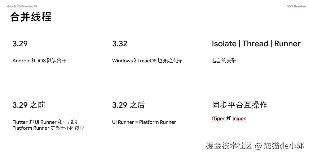 在 3.32 开始, Windows 和 macOS 也开始支持合并 Dart UI 线程和平台线程,这个合并其实从 3.29 就开始了,而它的最终目标肯定就是在全平台上都让 Dart UI 线程和平台线程合并统一。