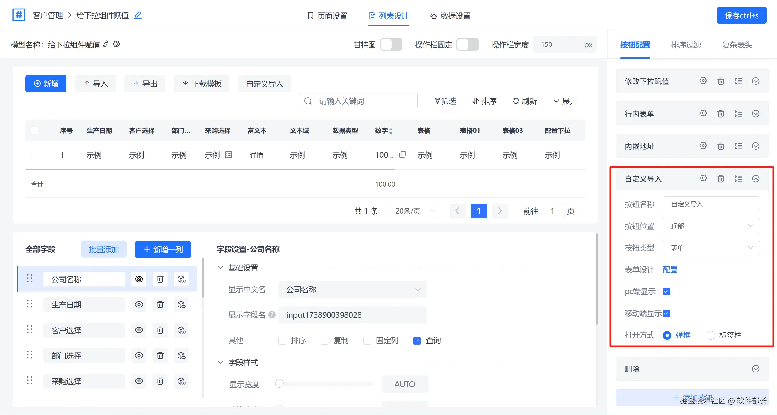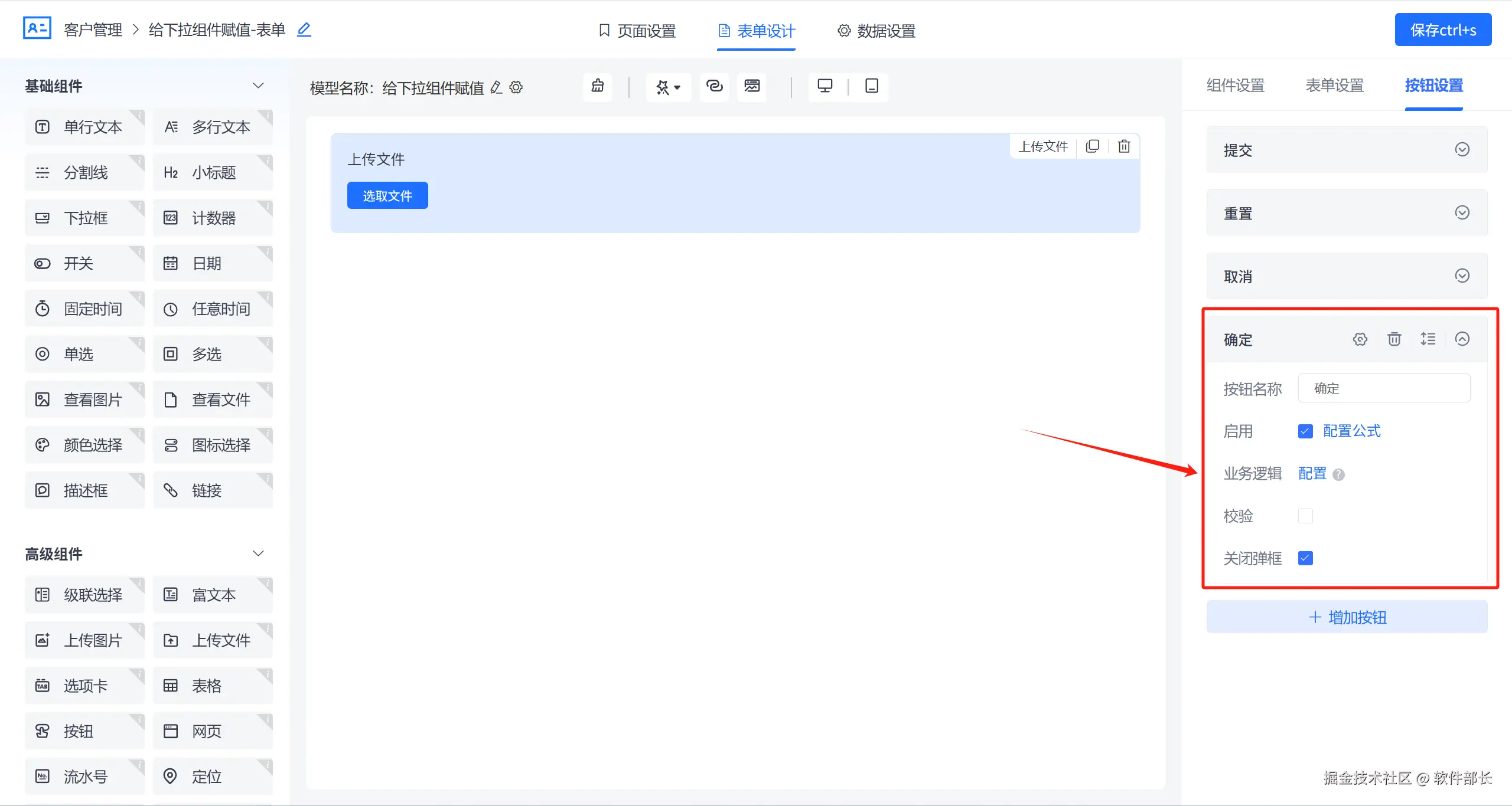 在表单按钮上添加自定义按钮,用于触发逻辑,如下图