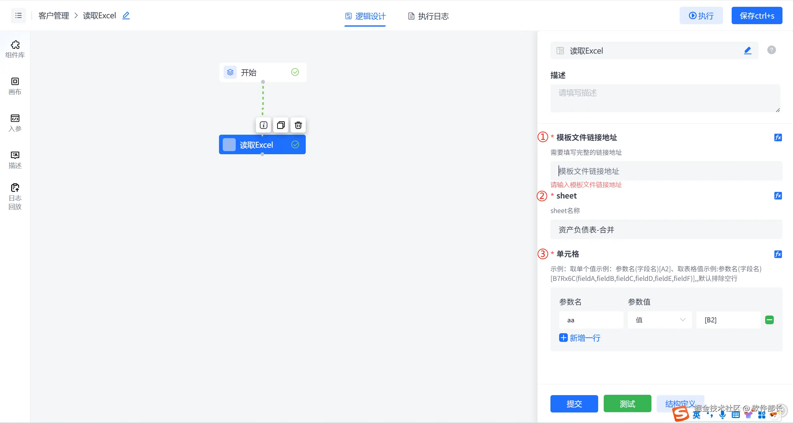 进入逻辑引擎设计器中,拖取【读取Excel】组件