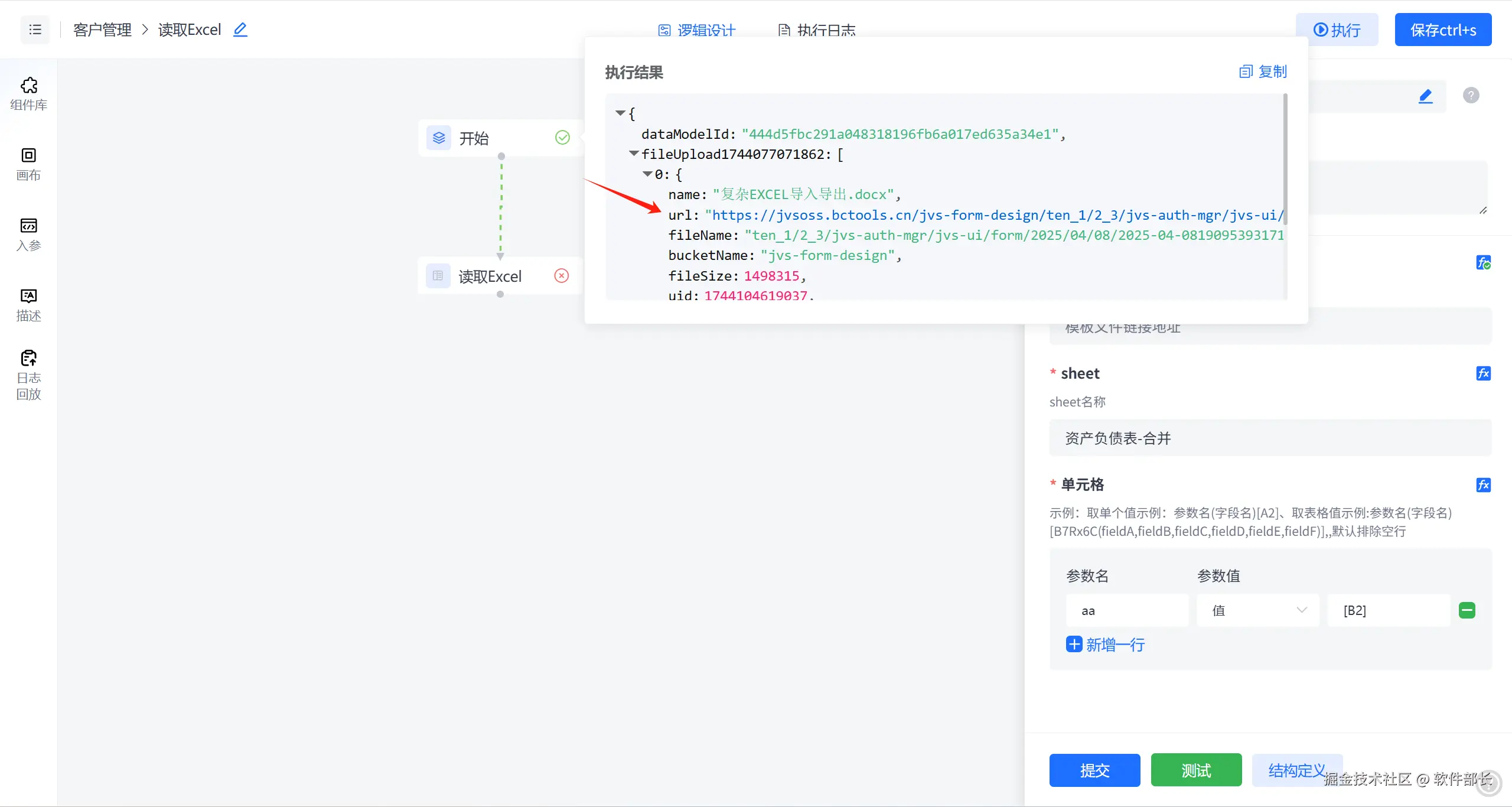在JVS低代码逻辑引擎中,读取Excel组件是用于自动化解析和处理Excel文件的核心功能模块。它可以根据单元格解析Excel数据,主要用于复杂Excel表格数据读取,支持单个单元格取值和整个表格取值,区别于【文件解析】组件主要是常规的Excel表格数据列项读取。并且可以与系统其他节点(如数据库、API接口、表单等)无缝对接,实现数据的高效流转和自动化处理。
