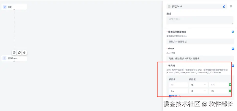 ②:sheet,填写上传的excel模板文件的sheet名称,注意:如果有多个sheet用多个【读取Excel】组件配置读取