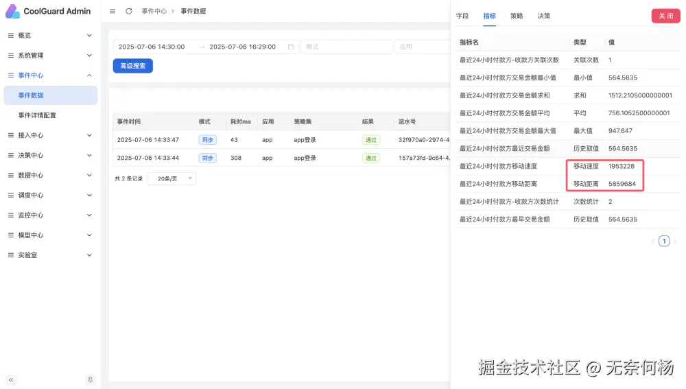 同时事件数据可以看到,经过验证两点的距离和速度算的都是正确的。