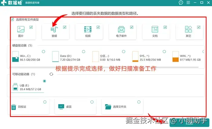 步骤1: 开启数据 蛙恢复专家,进入软件首页后选择需要恢复的文件和U盘,最后开启软件的扫描工作;