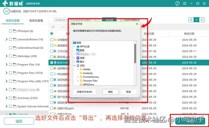 步骤3: 选好文件后点击“导出”;最后还需要在小弹窗中选择文件合适的存放位置。