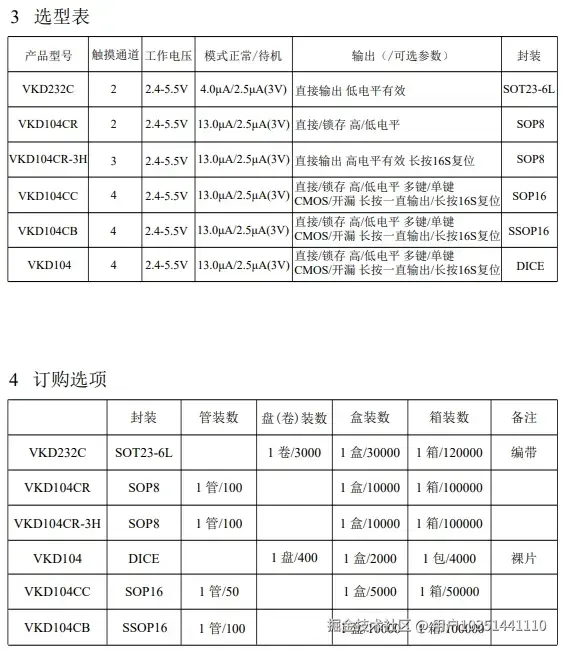 VKD104BR-3H/VKD104CR-3H 工作电压/工作电流/待机电流:2.4V-5.5V/13μA/2.5μA(3V) 感应通道数:3 输出方式:直接/锁存输出 最长响应时间快速模式60ms,低功耗模式160ms @VDD=3V 封装:SOP8 低功耗