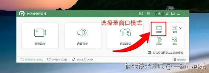 步骤1:电脑看视频怎么录屏?找到电脑桌面上的数据 蛙录屏软件,双击打开!软件一启动,好几种录制模式直接蹦出来——游戏录制、屏幕录制、窗口录制……录制电脑视频就选 “窗口录制” 模式。