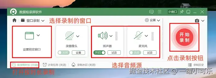 步骤2:接下来是设置环节!先用鼠标框选你要录制的窗口,然后看音频设置:想边录边解说就开麦克风,只录电脑声就关掉麦克风。偷偷告诉你,还能设置 “定时录制” ,彻底解放双手!所有参数调好后,直接点那个红彤彤的 “开始录制” 按钮开录!