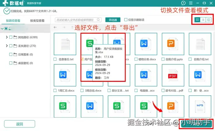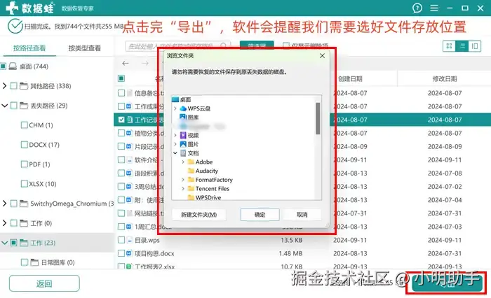 步骤2: 扫描结束后,显示文件的位置上选中自己需要恢复的文件,勾选中后点击“导出”。