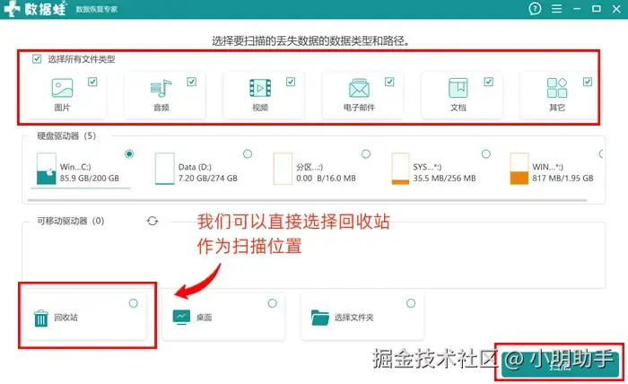 回收站清空了还能恢复吗?在电脑中使用数据 蛙恢复专家,通过软件的首页发现,我们可以直接选择回收站作为扫描对象,大大简化了回收站数据恢复的流程,实现回收站一键恢复。