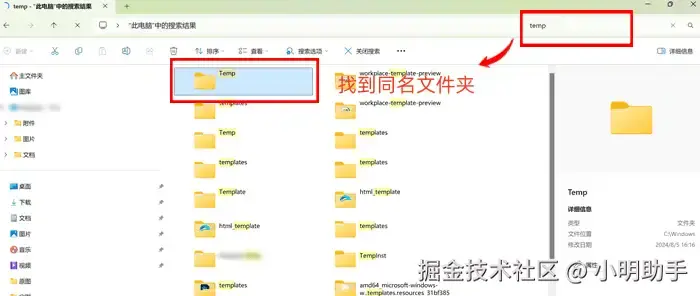 在“此电脑”中,我们可以搜索“temp”文件夹,找到同名文件后点击进入搜索。