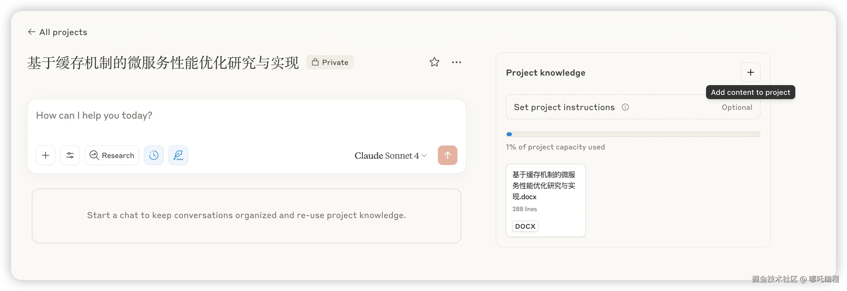在进行Claude对话的时候,可以选择已经创建好的Projects,相当于给问题一个问题背景,实现了跨会话保持上下文的连续性。