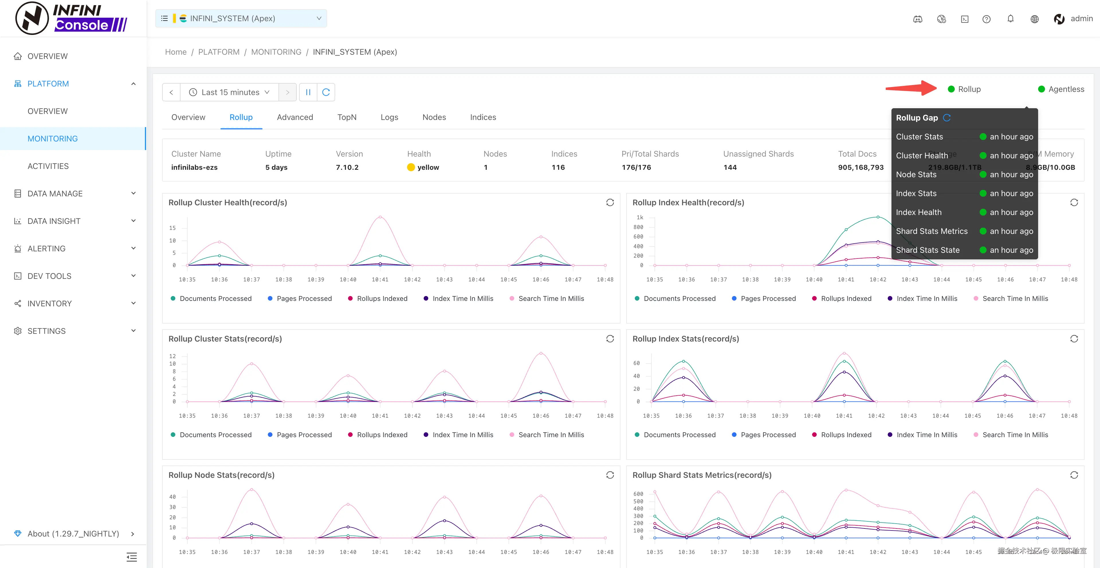 - INFINI Console v1.29.6 系统集群新增 Rollup Gap 指标,修复监控图表异常毛刺、历史数据 top 索引查询指标异常等问题。