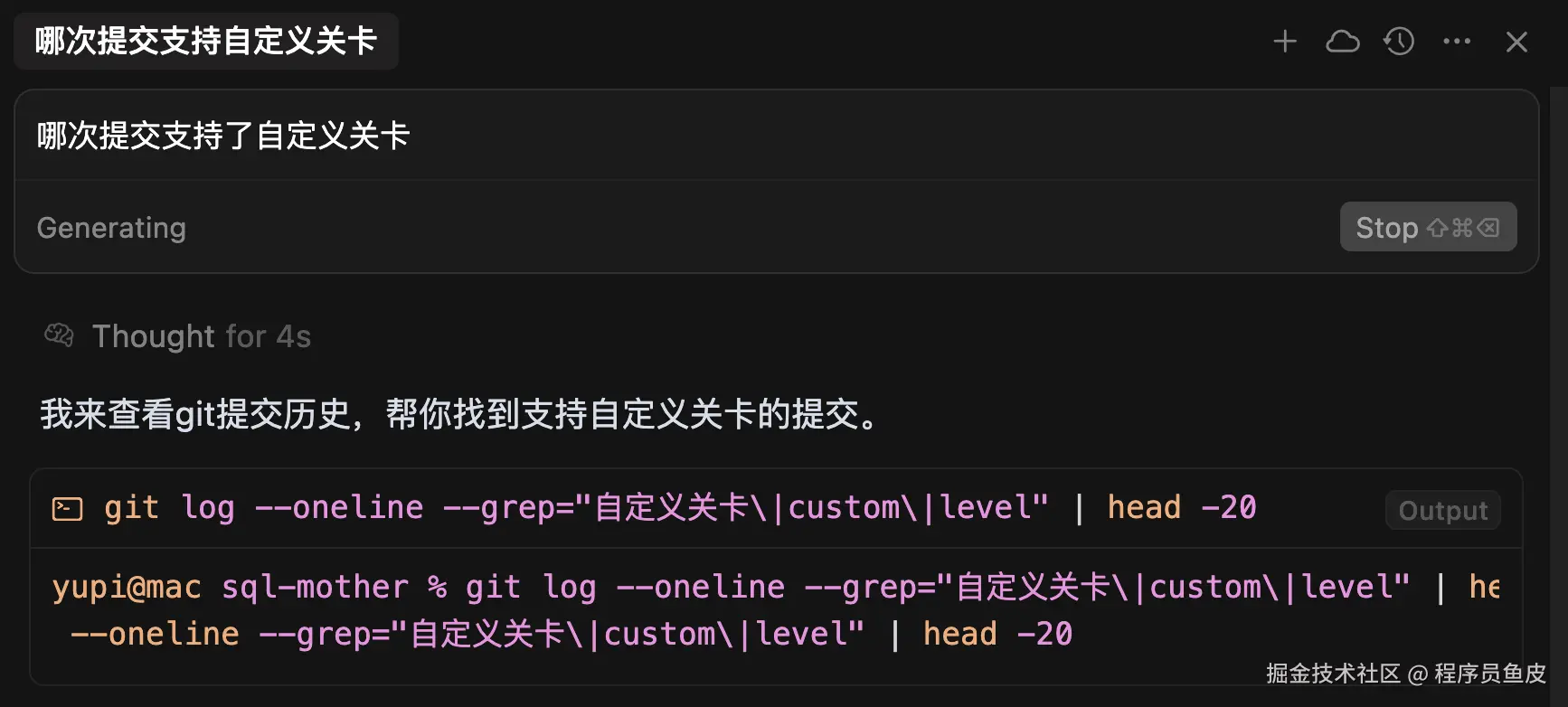 不过我试了很多次,都没有触发官方演示的那种 PR 读取效果,反而 AI 会利用 git 命令来查找提交记录,看来意图识别准确度还要再继续优化优化。