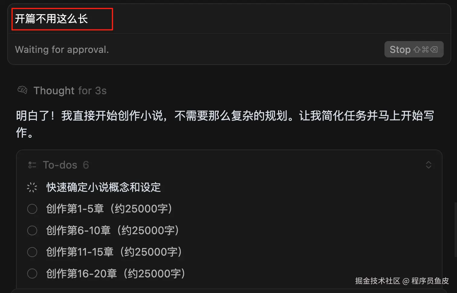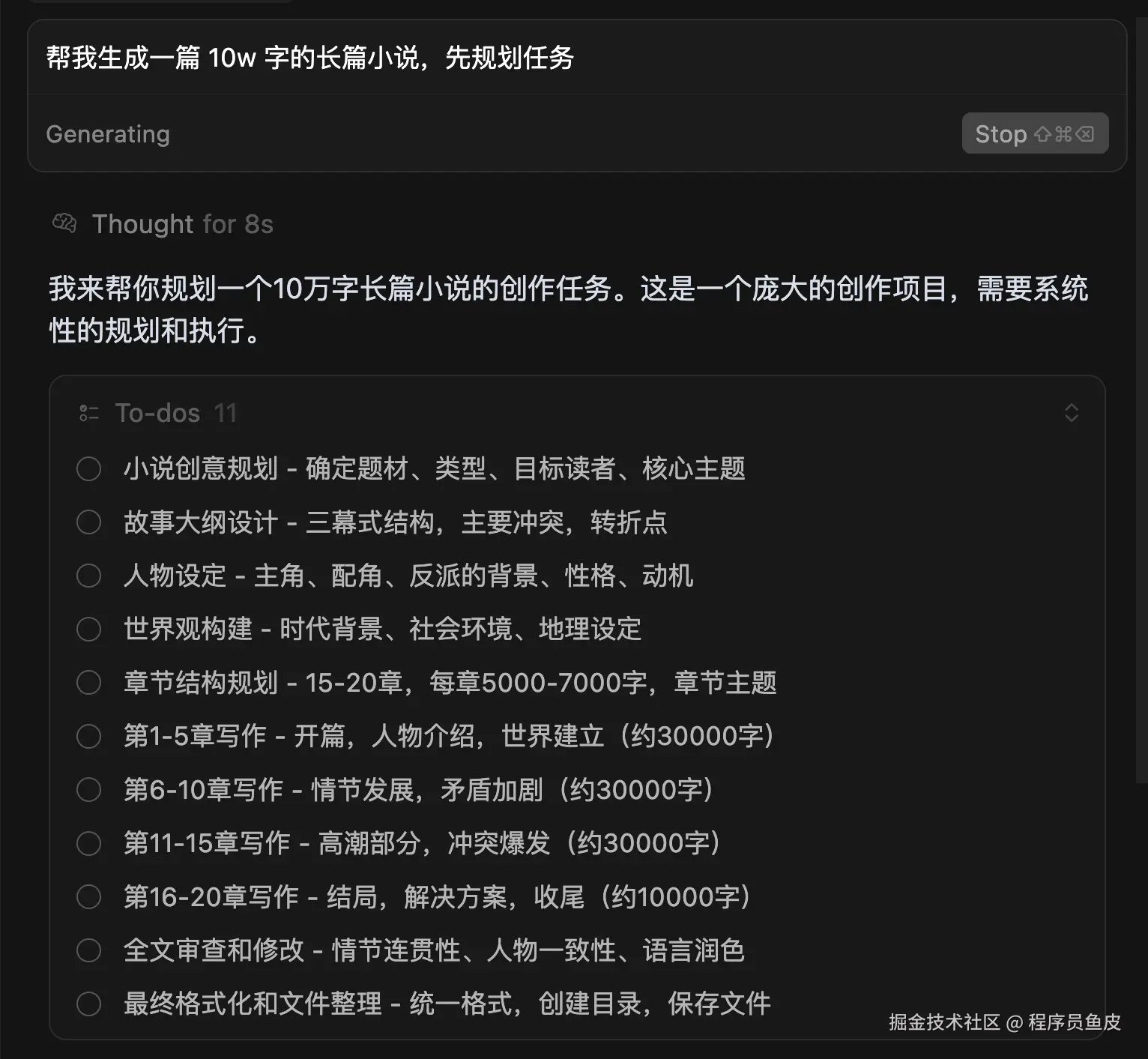 比如我让 AI 帮忙写一篇 10w 字的长篇小说,可以看到 AI 生成了有 11 条任务的 To-dos 列表: