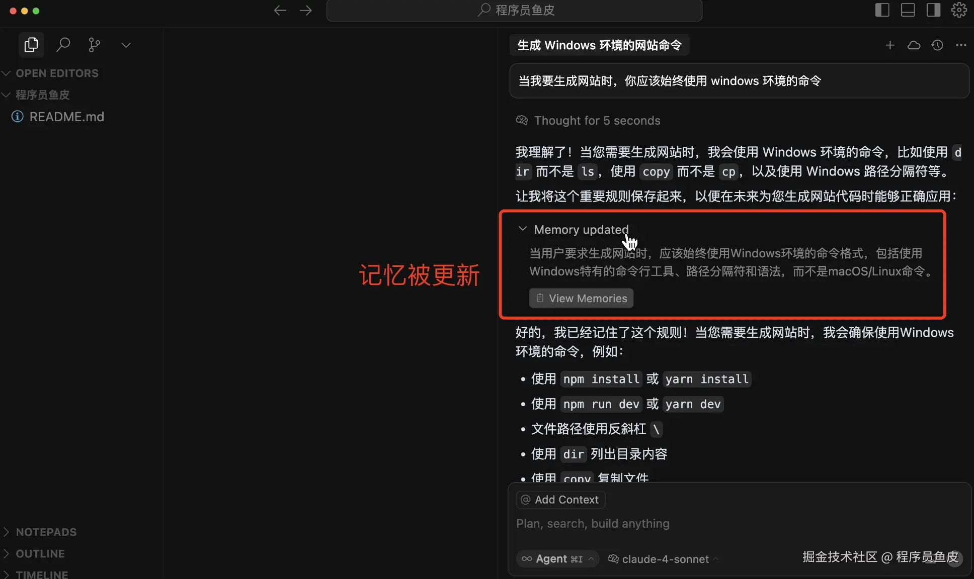 举个例子,我这里让 AI 以后尽量用 Windows 系统的命令来生成代码。执行后,可以看到记忆被更新了,里面是一条规则。