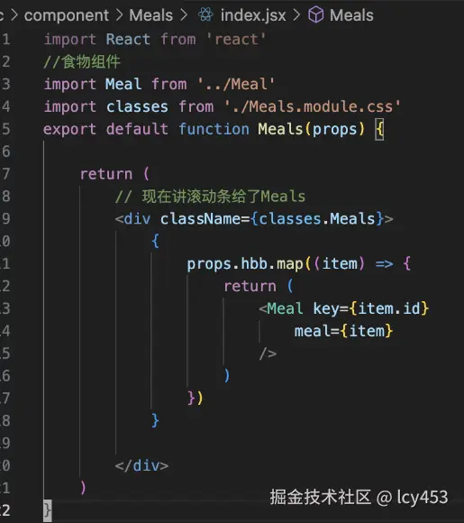 然后Meals组件遍历传过来的数组,把里面的每一个对象作为参数传递给Meal列表组件,然后列表组件就可以去展示了。