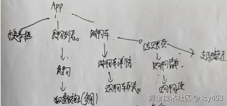 我们拿到了成品图,我们就需要去拆分成组件,首先第一个图片,我们拆分成三个组件,搜索框组件,列表展示组件,购物车组件,然后列表展示组件需要子组件作为列表的每一个元素。然后列表子组件的按钮都需要使用,所以也作为一个组件。这个按钮都可以使用,那么我们作为一个UI组件。购物车组件可以展开,展示购物车详情,这也是一个组件,然后套用列表组件,点击结算出现支付页面也是一个组件,包含的是购物清单,和支付按钮组件。