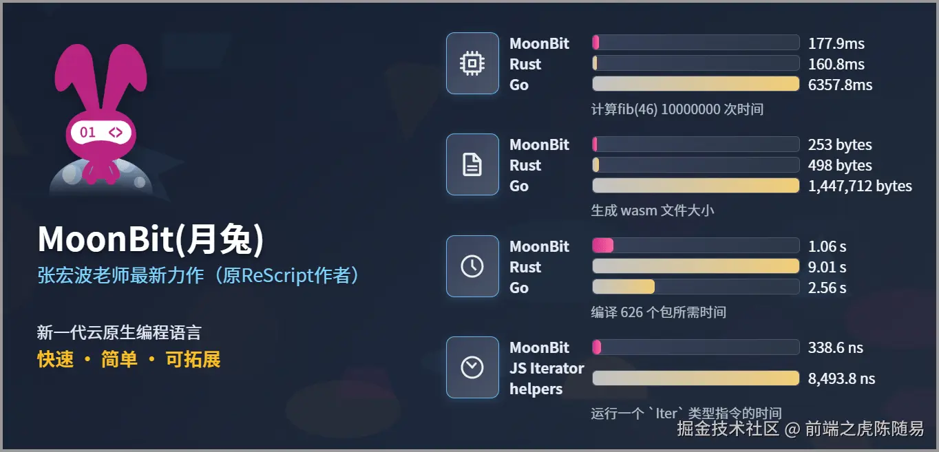 随着时间的推移,张宏波老师于2022年,带来了他的最新力作,也就是本文的主角:MoonBit 编程语言,中文名称叫做 月兔。