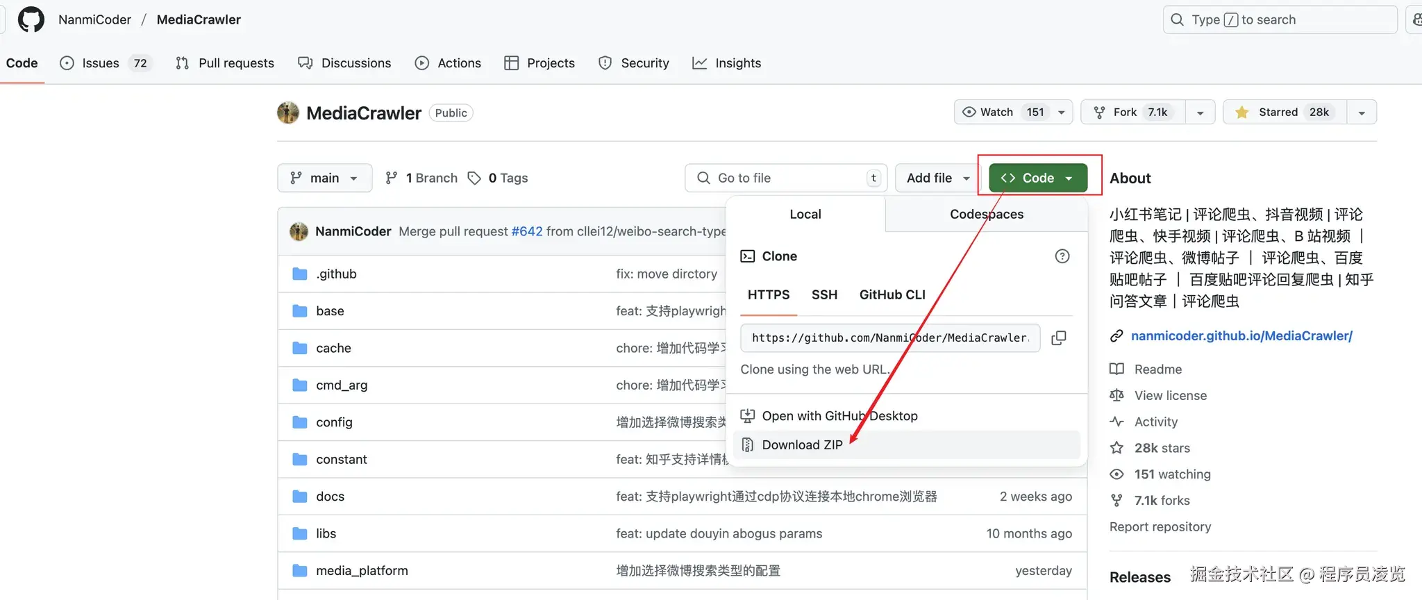 访问 MediaCrawler GitHub 仓库,点击“Code”按钮下载项目代码。
