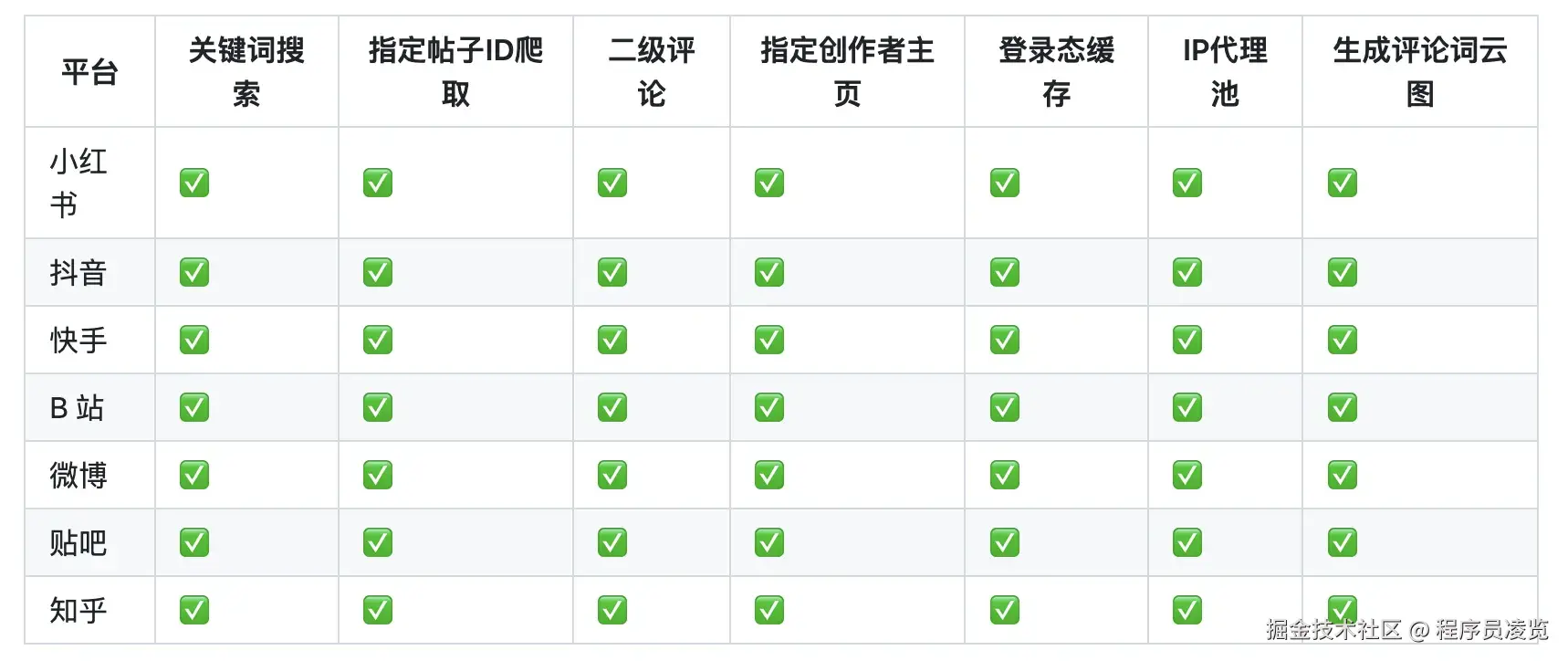 这个项目可以实现小红书、抖音、快手、B站和微博的爬虫功能,覆盖了当下热门的自媒体平台。