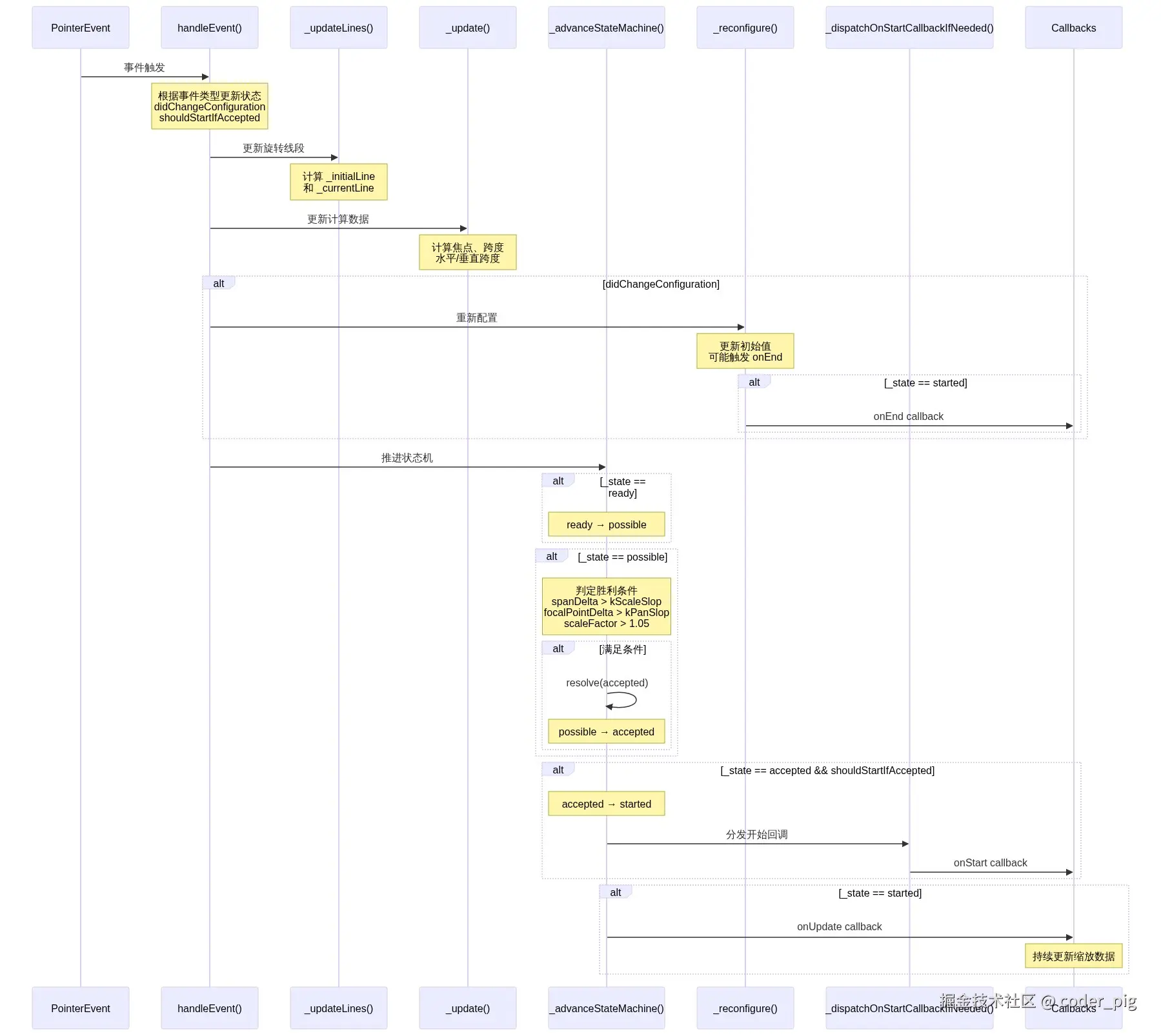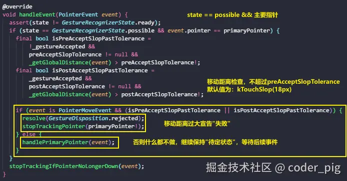 - 焦点移动:计算当前焦点与初始焦点的直线距离,超过 computePanSlop() 阈值(通常18像素)即认为是 "拖拽" 意图。