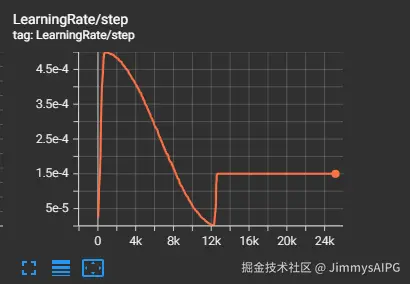 - 回到学习率曲线图,在12.5k步的位置,学习率突然“跳”到了一个较低的恒定值(1.5e-4),并一直保持不变。
