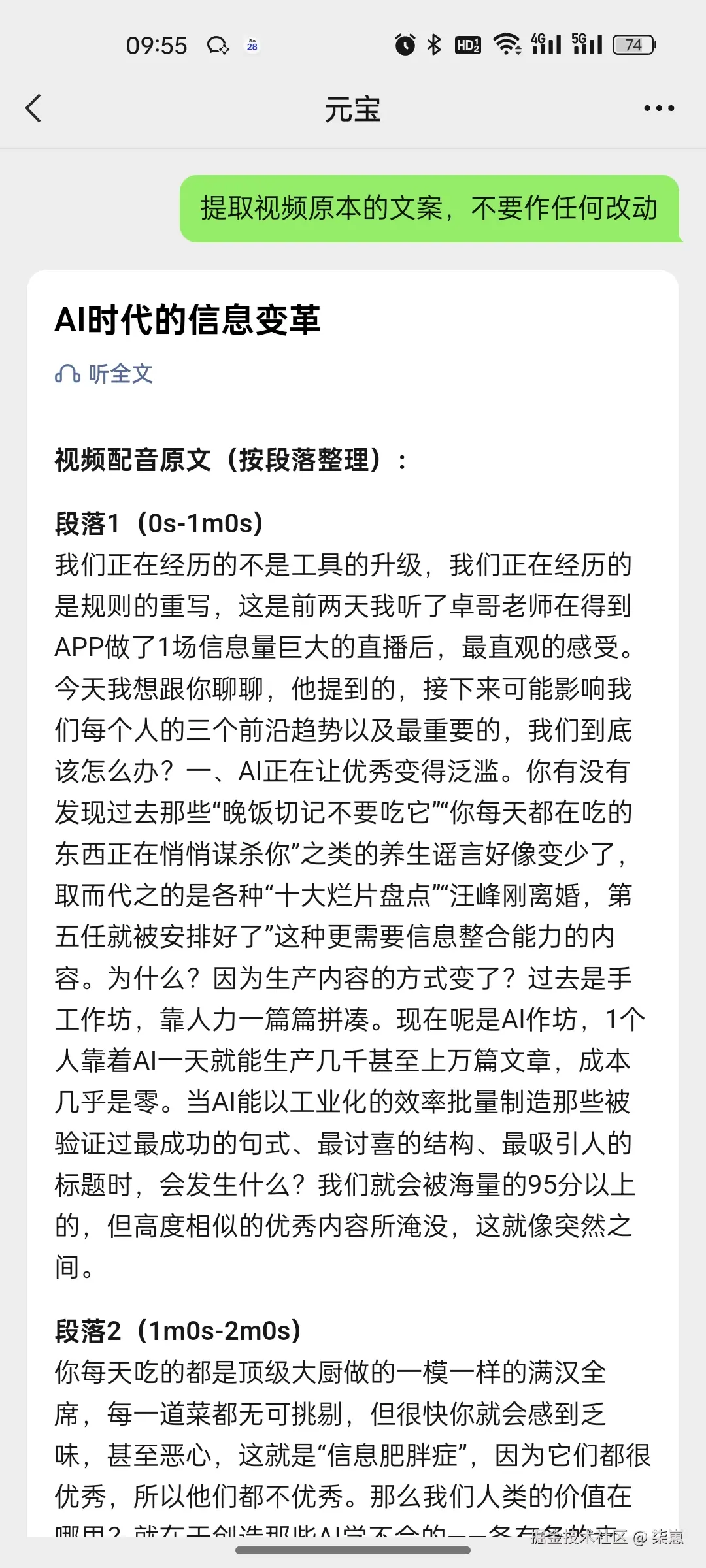 默认情况下,元宝会对视频文案做一个总结,如果你想要原文本,可以使用下面的提示词。